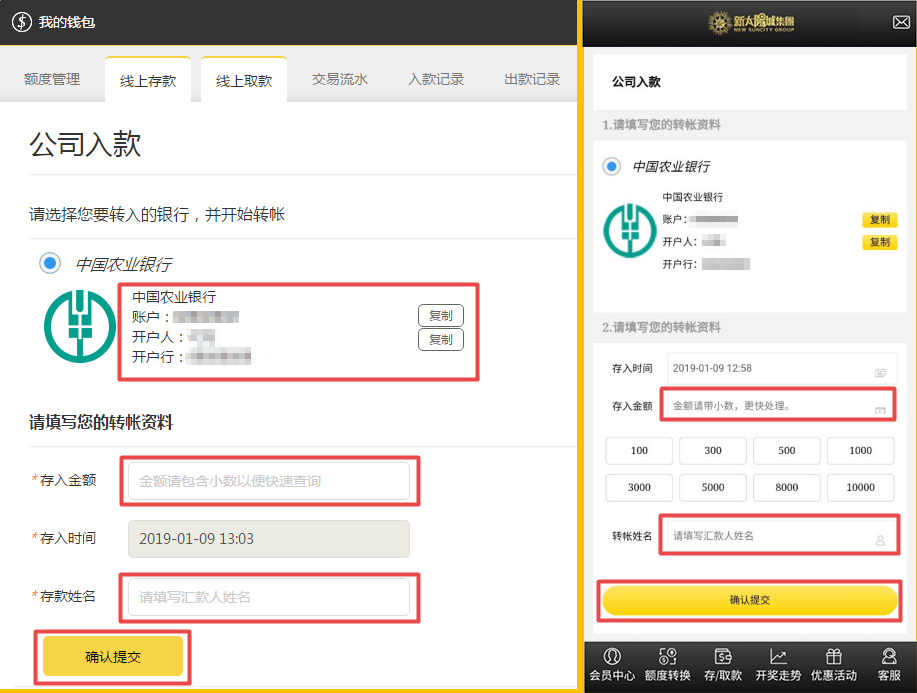 电脑用户:进入公司入款页面,选择并记录好公司收款银行账户,登陆您的网银/手机银行进行转账,或者到银行柜台/ATM进行汇款;转账成功后,填写存入金额(精确到小数点),存款姓名(所使用的扣款银行卡户主姓名),点击确认提交。(温馨提示:务必先转账再确认提交, 否则财务人员查询不到